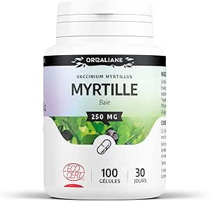 Ingrédients (pour 3 gélules) : Poudre de Myrtille baie * : 750 mg, Tunique (Hydroxypropylméthylcellulose) : 225 mg